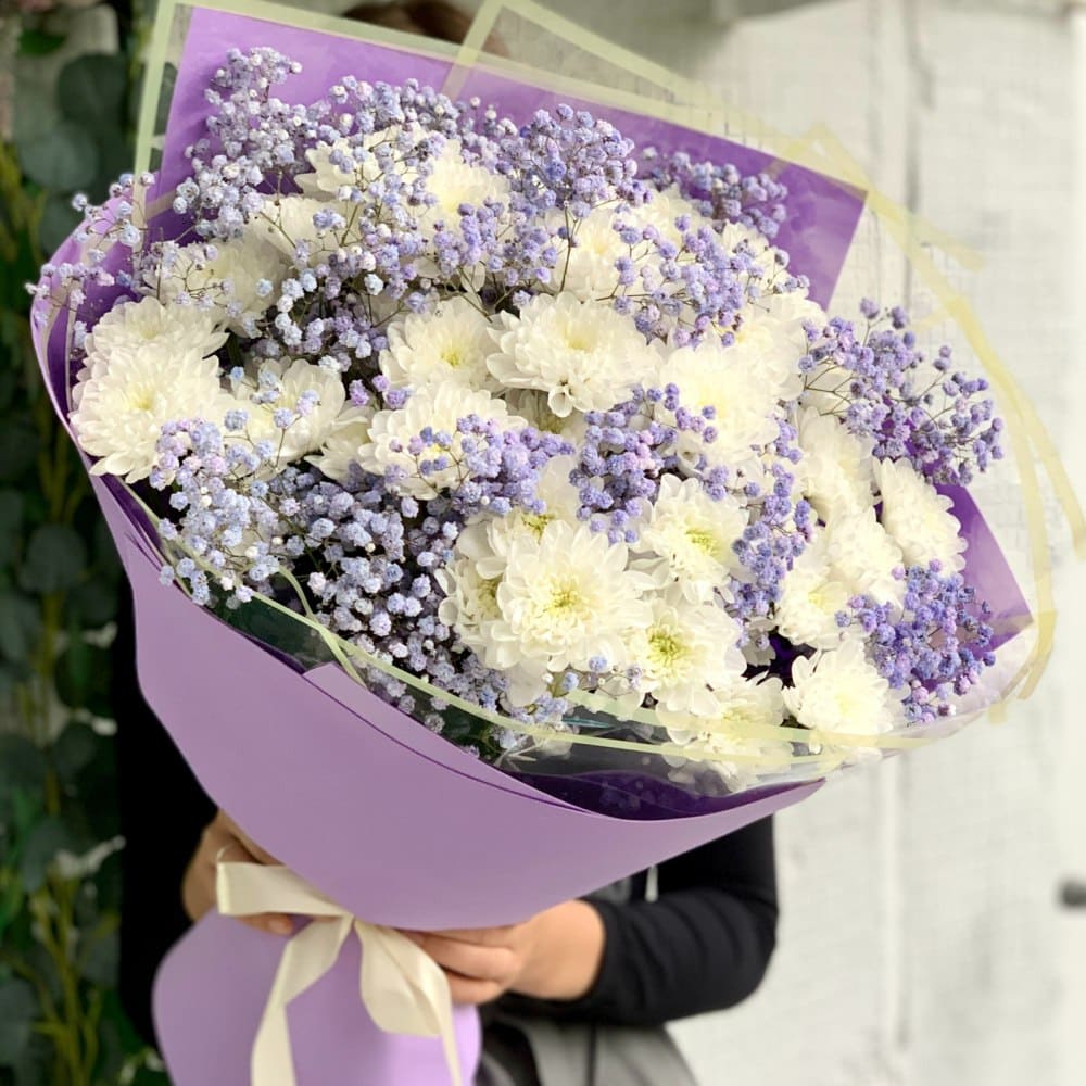 Букет из хризантем и гипсофил с доставкой по Казахстану – это нежная и воздушная композиция, наполненная легкостью и свежестью. Сочетание пышных хризантем и мелких белоснежных гипсофил придаёт букету романтичный и изысканный вид. Описание: Нежная красота: Хризантемы создают объем и пышность, а мелкие цветочки гипсофил добавляют легкости и делают букет воздушным. Элегантная простота: Композиция выглядит утонченно и изящно благодаря гармоничному сочетанию крупных и мелких цветов. Подходит для любого случая: Этот букет станет отличным подарком для дня рождения, юбилея, поздравления с достижениями или просто для того, чтобы порадовать любимого человека. Свежая зелень: Легкая зелень дополняет букет, придавая ему природную свежесть и гармонию. Стильное оформление: Букет аккуратно упакован в стильную бумагу, которая подчеркивает его утонченность и нежность. Доставка по Казахстану: Мы предлагаем быструю и надежную доставку по всему Казахстану, чтобы ваш подарок всегда был свежим и доставлен вовремя. Этот букет из хризантем и гипсофил – воплощение нежности и внимания, которое подарит радость и тепло вашим близким!